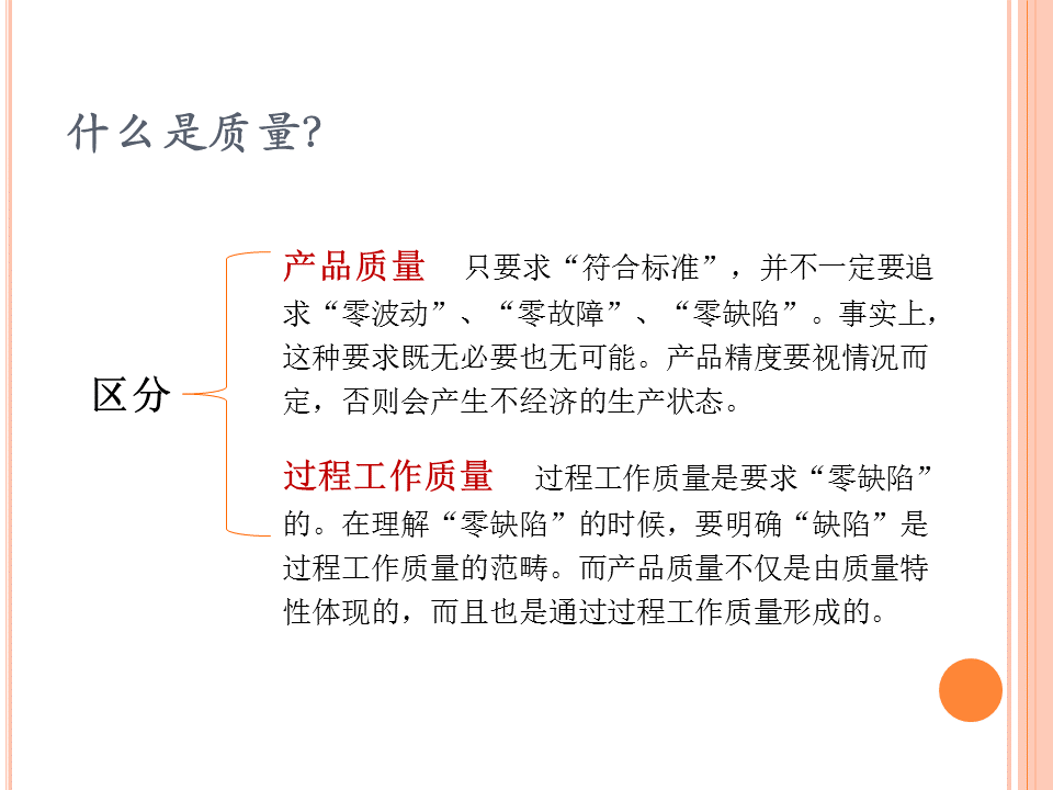 在工作中,零缺陷不僅是一種工作準(zhǔn)則和執(zhí)行標(biāo)準(zhǔn),也是一種工匠精神。零缺陷意味著要從內(nèi)心追求精益求精,要求組織中的每一個(gè)成員都要在工作中下決心做到完美無(wú)缺。 “零缺陷”的思想是一種新的思維方式,是一種工匠心做事心態(tài),是企業(yè)參與國(guó)際市場(chǎng)競(jìng)爭(zhēng)的有力保障,也是提高個(gè)人能力和公司整體素質(zhì),最大限度地發(fā)揮公司整體功能,弘揚(yáng)公司企業(yè)文化的契機(jī)。無(wú)論是個(gè)人還是組織,只有追求產(chǎn)品的“零缺陷”,才能長(zhǎng)久地在該領(lǐng)域立