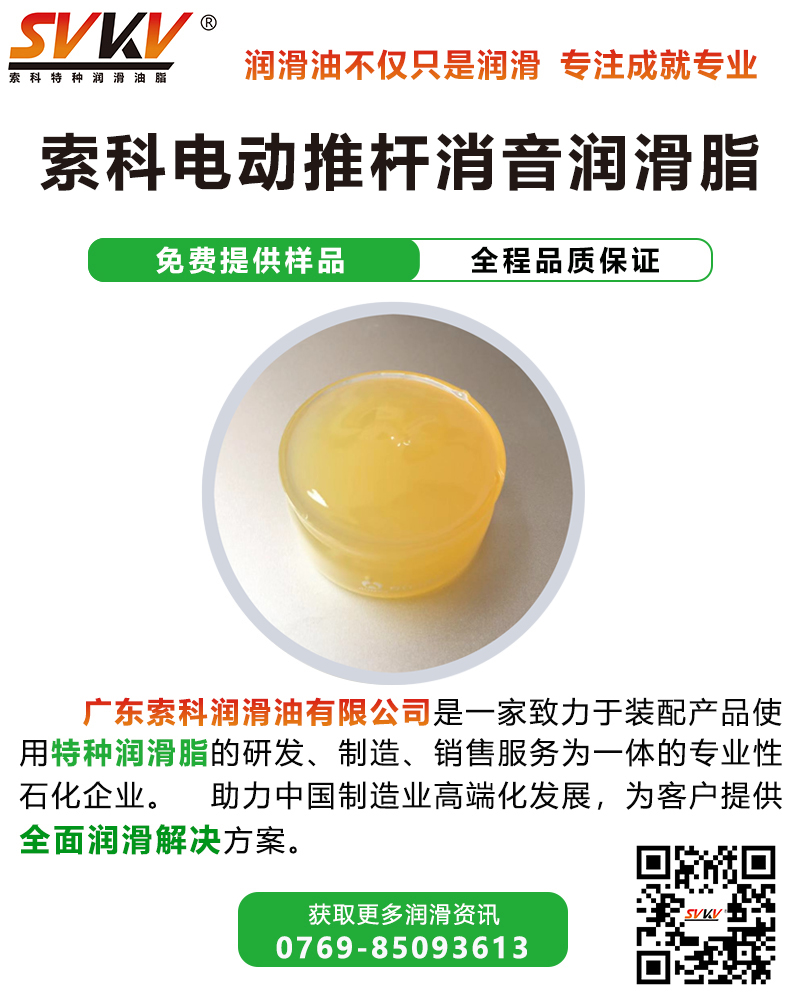 廣東索科潤滑油有限公司是一家致力于裝配產品使用特種潤滑脂的研發、制造、銷售服務為一體的專業性石化企業。致力為不同的客戶,提供專業的選油方案,協助客戶解決產品裝配時出現的各種難題還可根據客戶特殊需求訂做適合的潤滑油品。