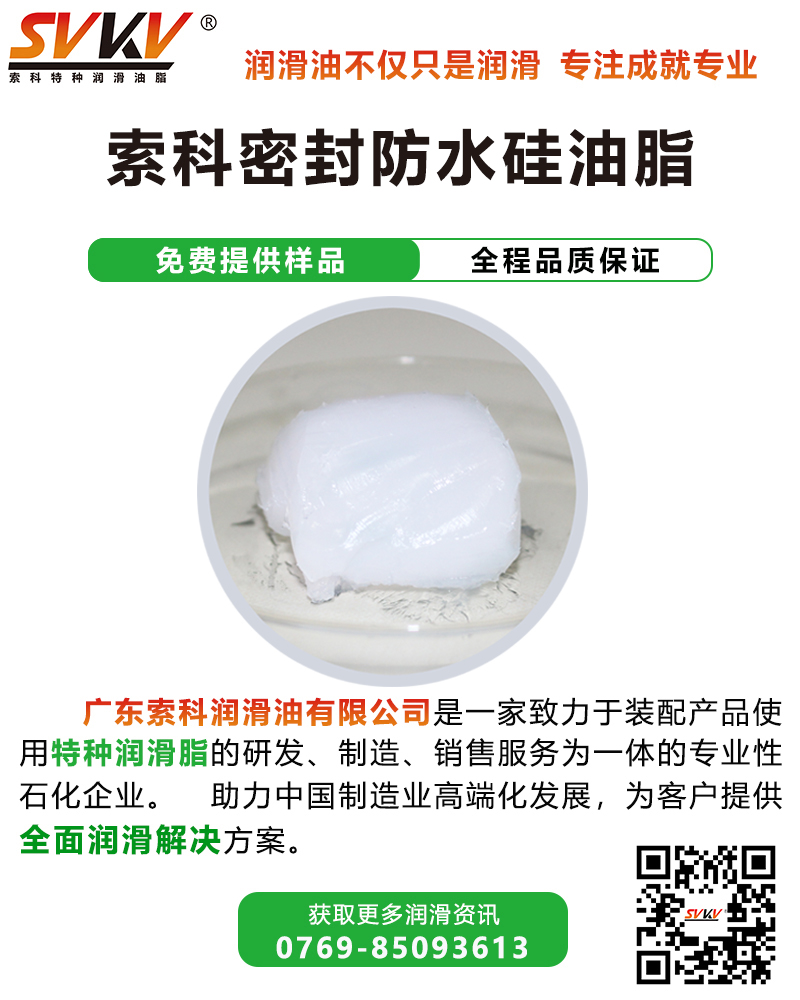 索科SVKV密封防水硅脂是由精煉合成油作為基礎油,并加有結構穩定劑、多種添加劑精制而成的特種油脂,具有良好的防水密封性,抗溶劑性和抗爬電性能,不腐蝕金屬,與橡膠具有較好的相容性。
