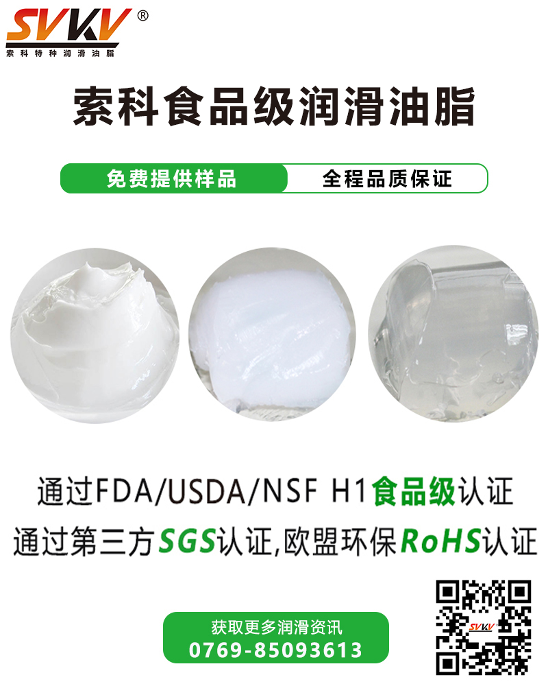 索科SVKV系列食品級潤滑油脂選用食品級的基礎油和無毒無害的添加劑精制而成,專為食品加工及醫療設備而研制。