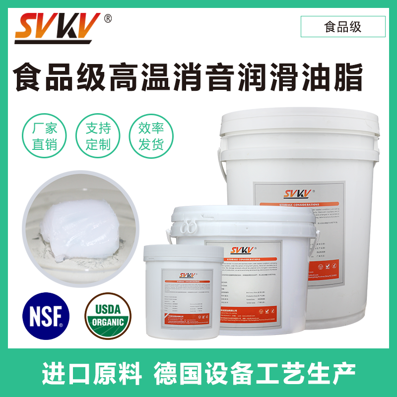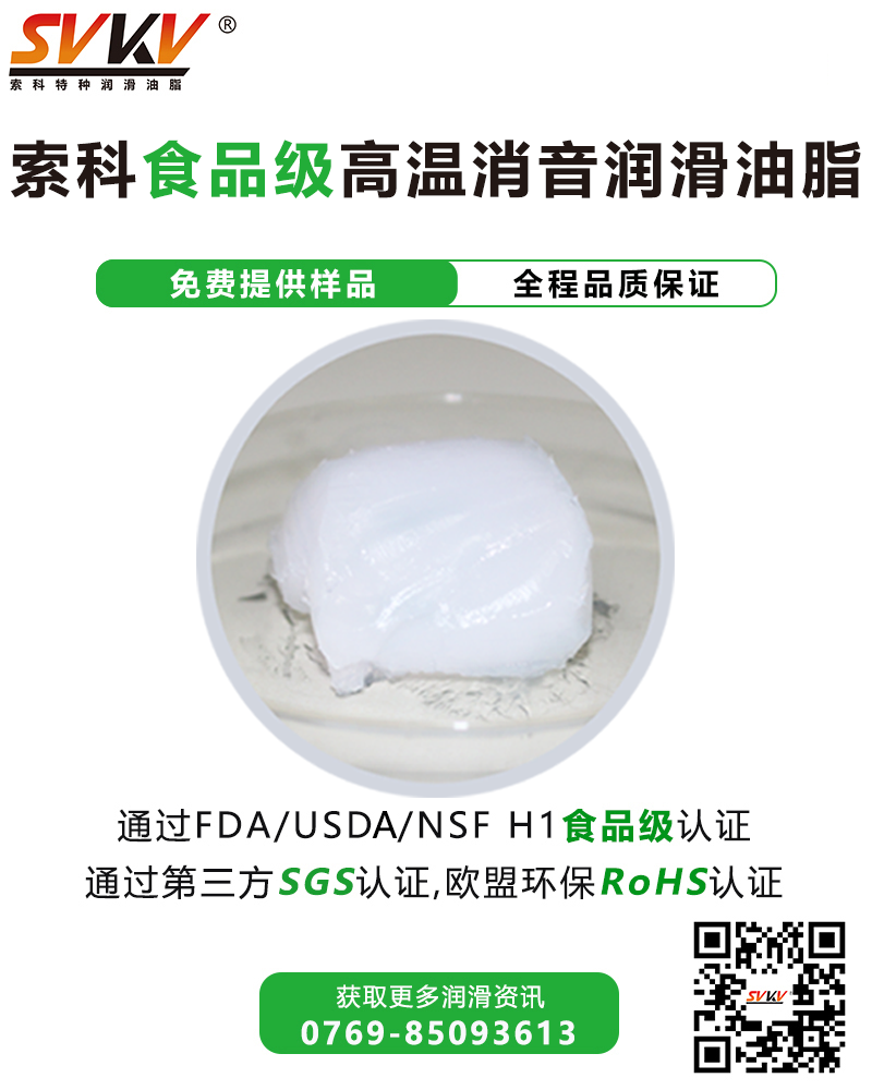 索科SVKV食品級高溫消音潤滑油脂選用食品級的基礎油和無毒無害的添加劑精制而成,專為食品加工和醫療設備而研制。索科SVKV食品級高溫消音潤滑油脂符合美國FDA和USDA法規和標準,并通過美國NSF H-1食品級認證,保障烤箱食品安全健康。