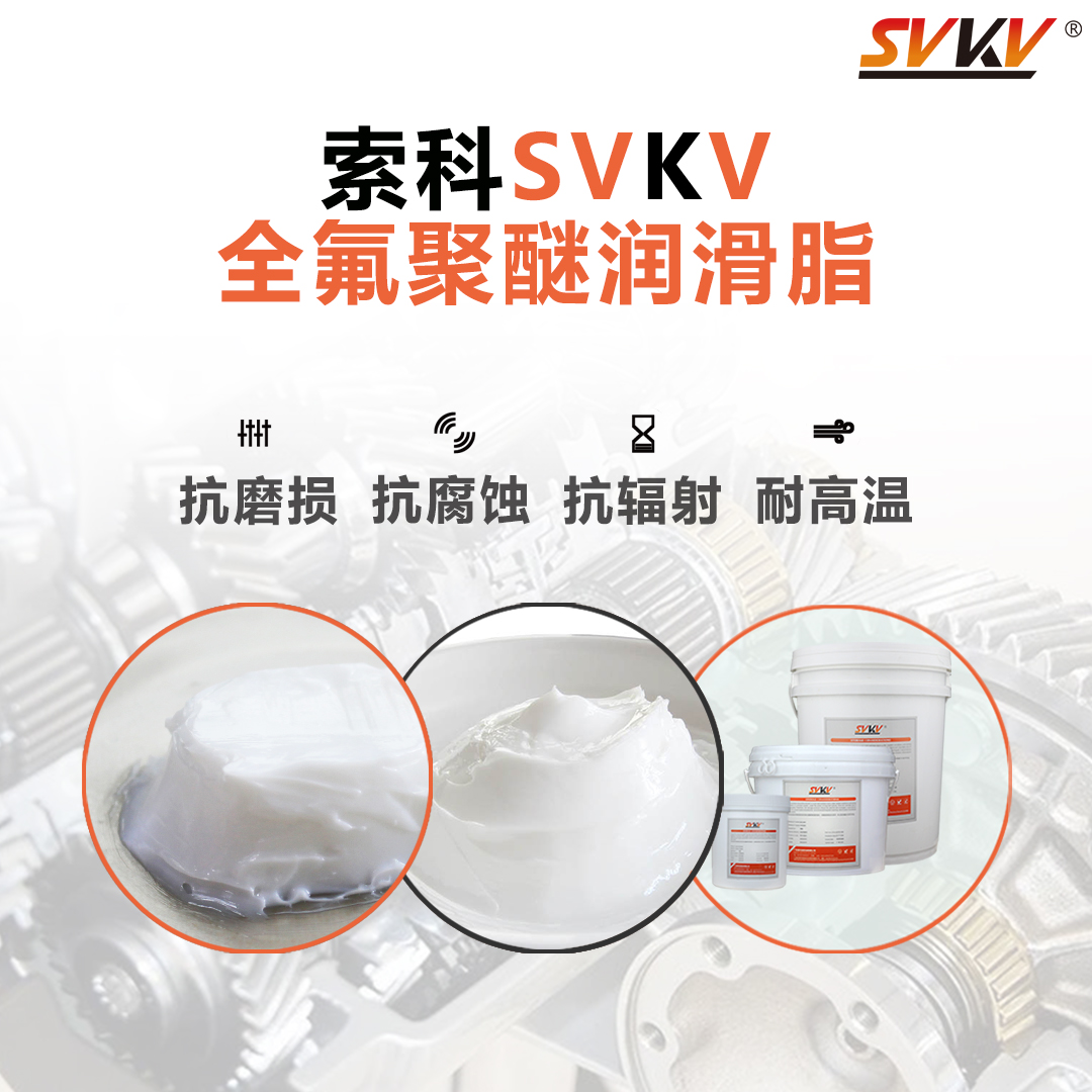 索科SVKV全氟聚醚潤滑脂是由聚四氟乙烯(PTFE)并添加特種抗腐蝕添加劑精制而成的白色全氟聚醚潤滑脂。氟素潤滑脂專用于高溫、高負載、化學腐蝕環境中的軸承、齒輪、頂針以及要求終身潤滑的部件,抗氧化、低揮發、不結焦、不積碳、抗腐蝕、耐磨損、抗極壓性好,特別是在極度高溫和惡劣環境下的使用。SK系列氟素潤滑脂可使產品壽命延10到60倍。