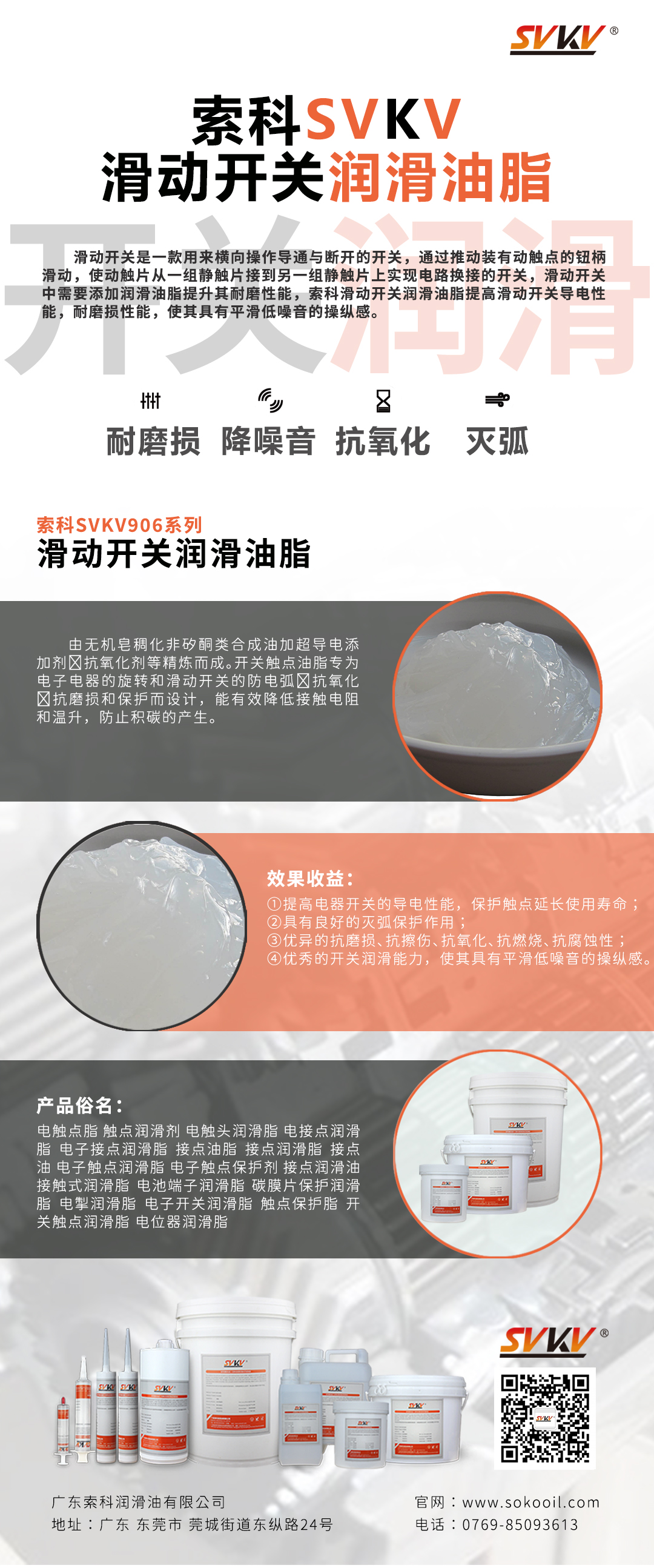 索科為企業提供潤滑方案,降本增效,適合的潤滑脂能有效提升導電性能,減少磨損,延長產品壽命。索科提供滑動開關潤滑油脂0769-85093613免費樣品,全程品質保證!